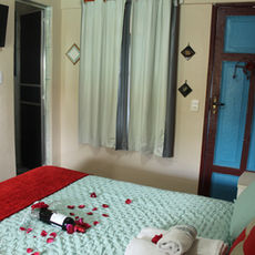 Quarto com banheiro e varanda, TV tela plana 28pol, Frigobar, cama de casal queen size, ventilador.